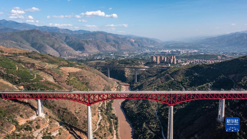 11月23日,復興號列車(chē)通過(guò)中老鐵路元江特大橋(無(wú)人機照片)。