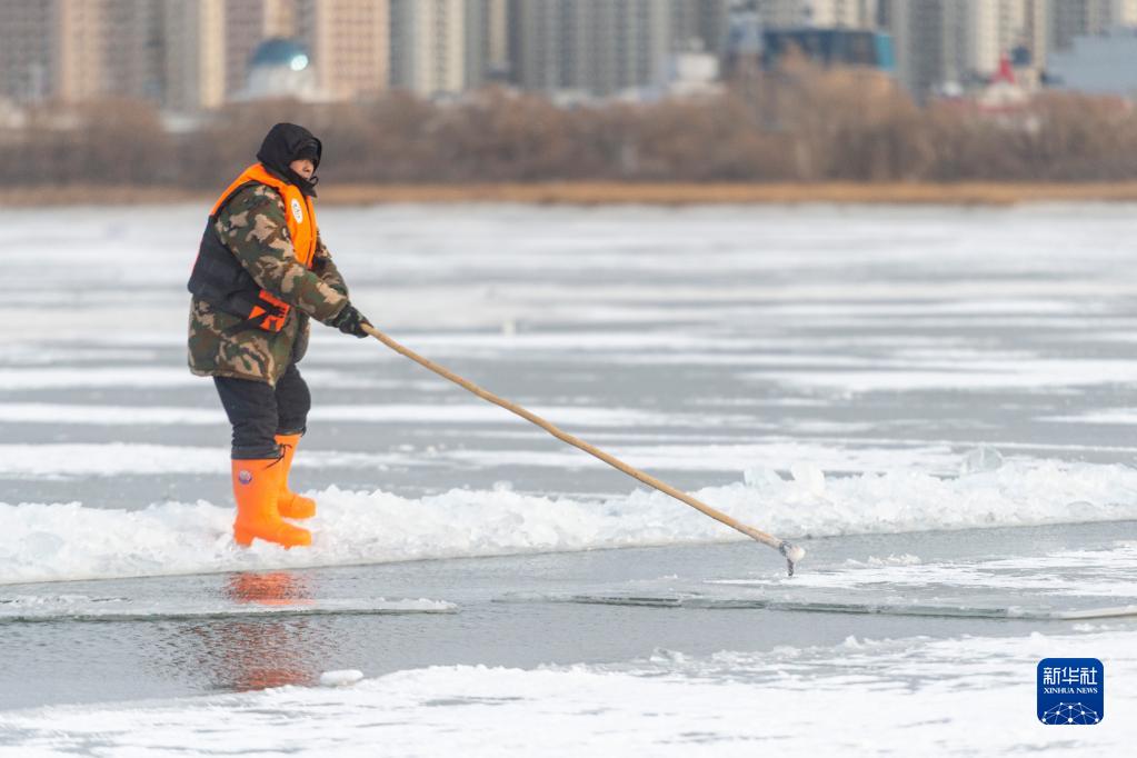 12月6日,工人在松花江哈爾濱段封凍的江面上采冰。