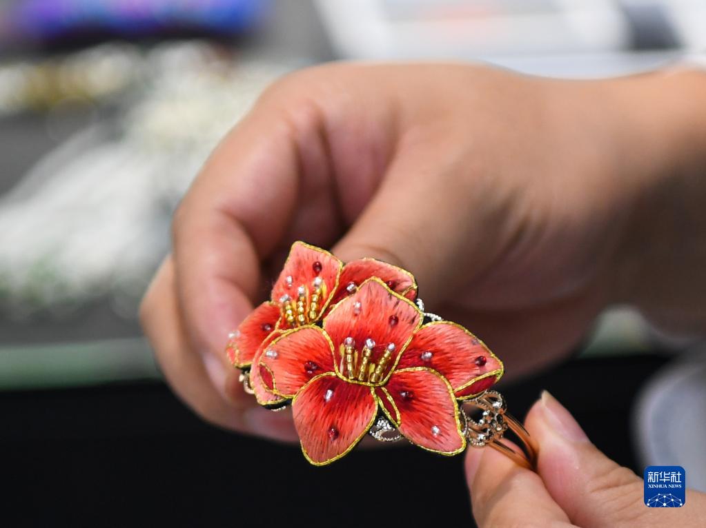 在廣州市荔灣區的工作室,王新元展示廣繡文創(chuàng )產(chǎn)品(12月6日攝)。