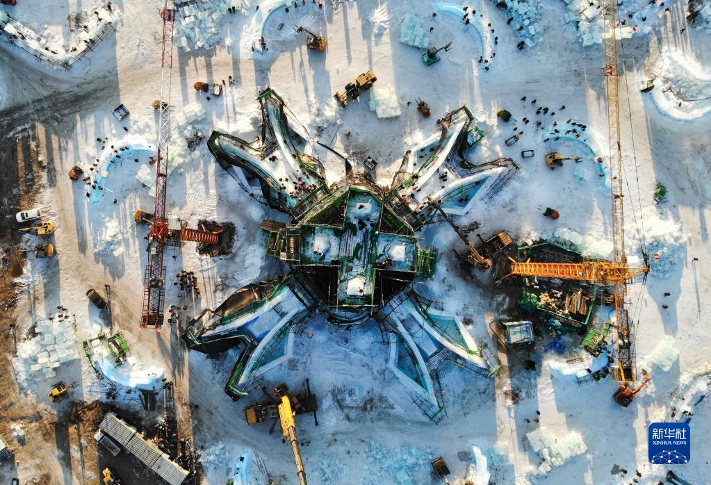 12月8日拍攝的哈爾濱冰雪大世界園區冰建項目施工現場(chǎng)(無(wú)人機照片)。