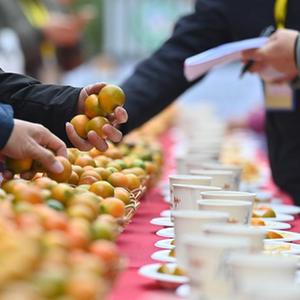 12月9日,在融安縣金桔擂臺賽現場(chǎng),評委對參賽金桔進(jìn)行綜合評比。