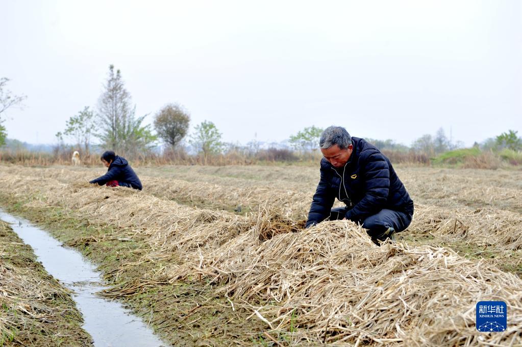 在江西省南昌市南昌縣幽蘭鎮,村民們在收割后的晚稻田里利用處理過(guò)的秸稈種植大球蓋菇(12月7日攝)。