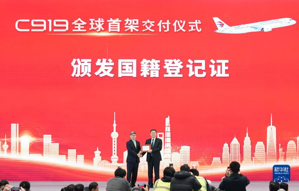 12月9日,在交付儀式現場(chǎng),民航華東地區管理局向東航頒發(fā)國籍登記證。