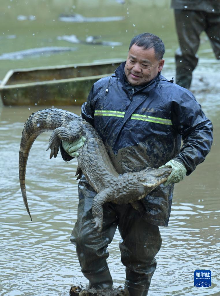 11月30日,在安徽揚子鱷國家級自然保護區夏渡片區,工作人員搬運飼養池內人工繁育的揚子鱷,準備將揚子鱷裝箱轉移到越冬暖房。
