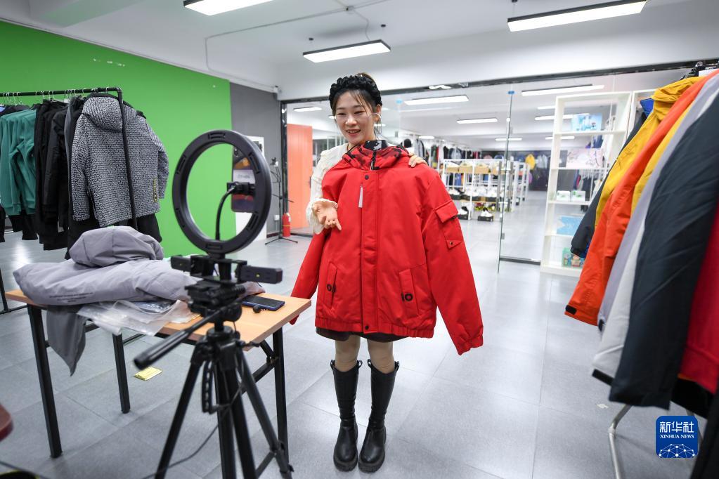12月9日,電商主播在獅城寧好電商網(wǎng)批(西部)運營(yíng)基地直播帶貨。
