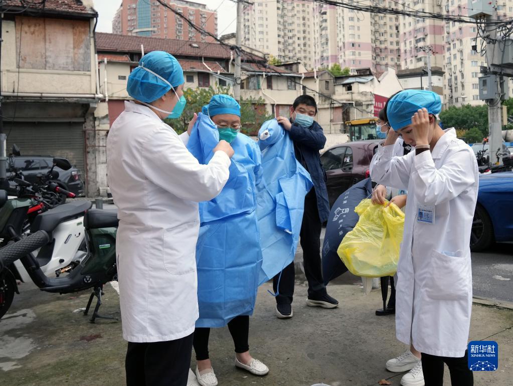 在黃浦區順昌路上,接種小分隊的醫護人員在小區門(mén)口穿戴隔離衣物(12月5日攝)。
