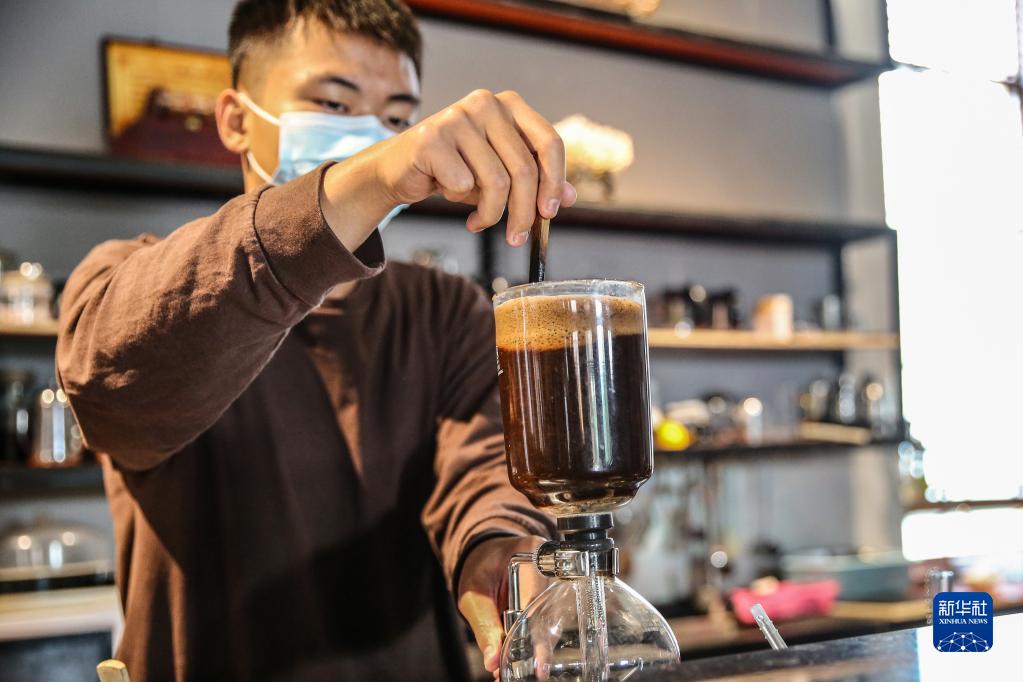 12月10日,在位于海南澄邁的才存咖啡館,返鄉大學(xué)生、咖啡師徐取凡在煮咖啡。
