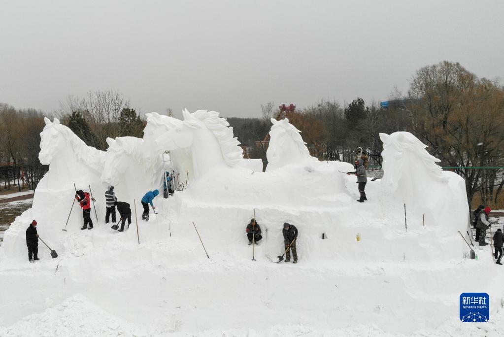 12月12日,工作人員在太陽(yáng)島雪博會(huì )園區制作雪雕(無(wú)人機照片)。