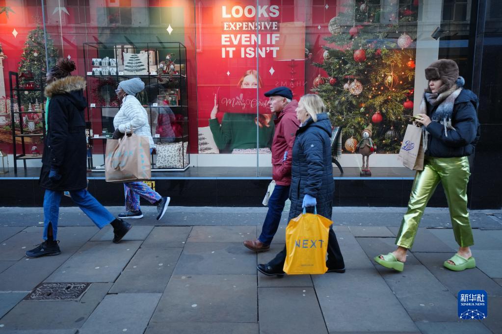 12月13日,人們走過(guò)英國曼徹斯特街上的促銷(xiāo)廣告。