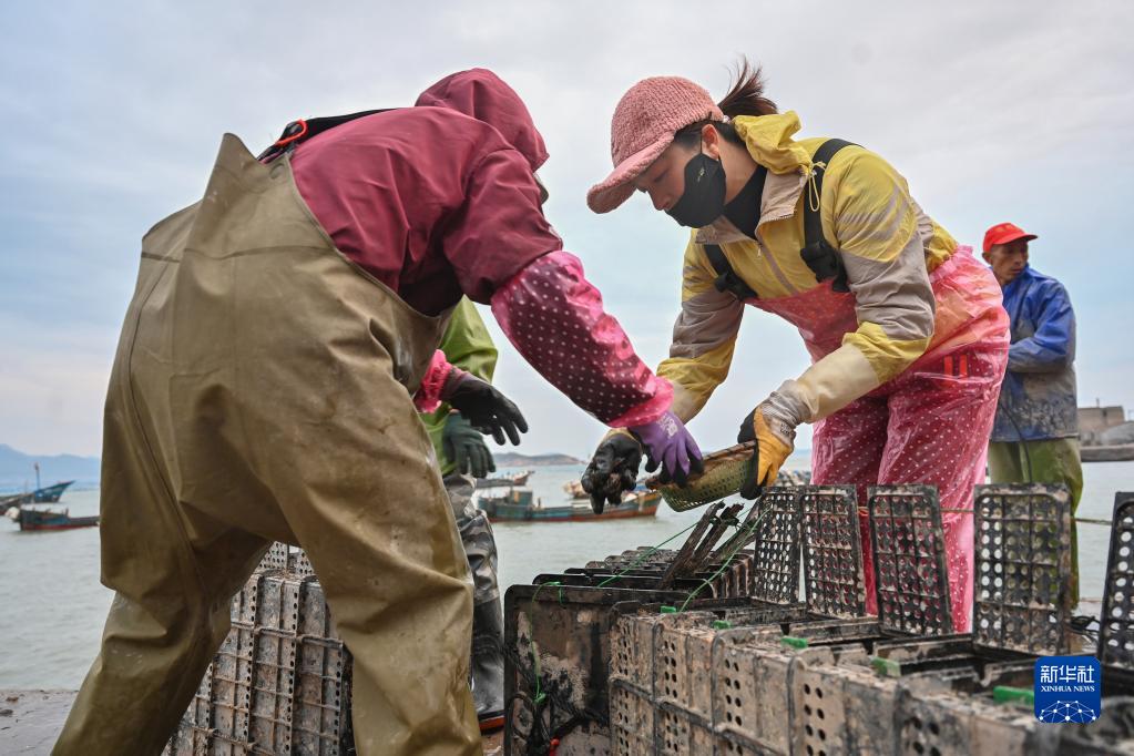 12月13日,在福建省連江縣后灣碼頭,村民在分裝鮑魚(yú)。