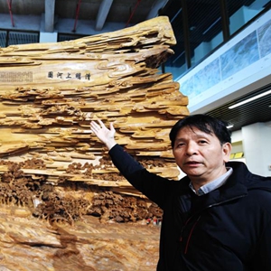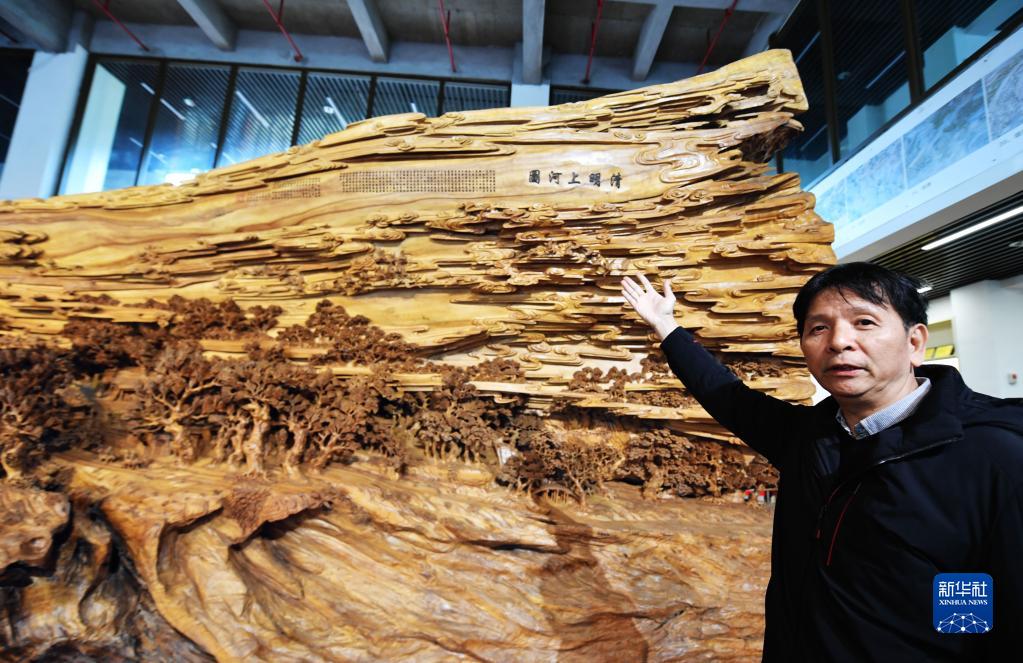 12月14日,國家級非遺項目莆田木雕省級代表性傳承人鄭春輝在介紹他的大型木雕作品《清明上河圖》。該件作品歷時(shí)近4年,在一棵長(cháng)13米、最大直徑達3.5米的千年古樟木上雕刻而成。