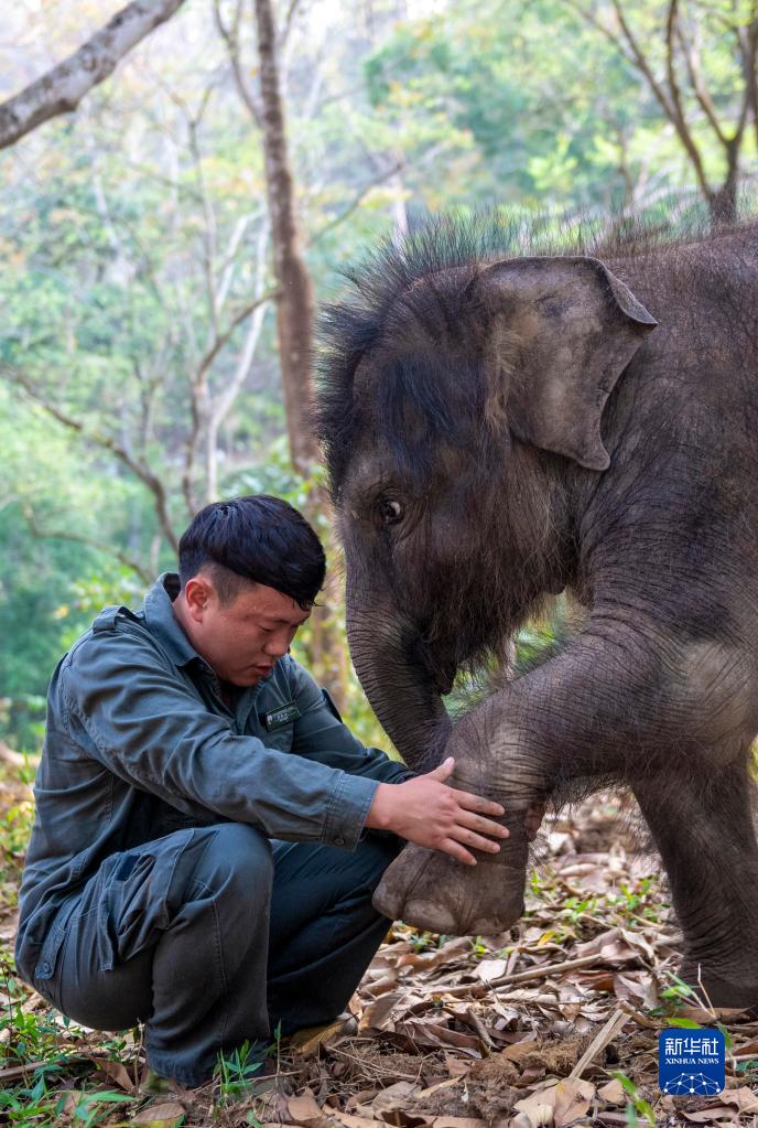 這是3月15日,在云南省西雙版納傣族自治州景洪市,云南亞洲象種源繁育及救助中心的“象爸爸”許云峰查看被救助幼象“龍龍”左前腿的恢復情況。