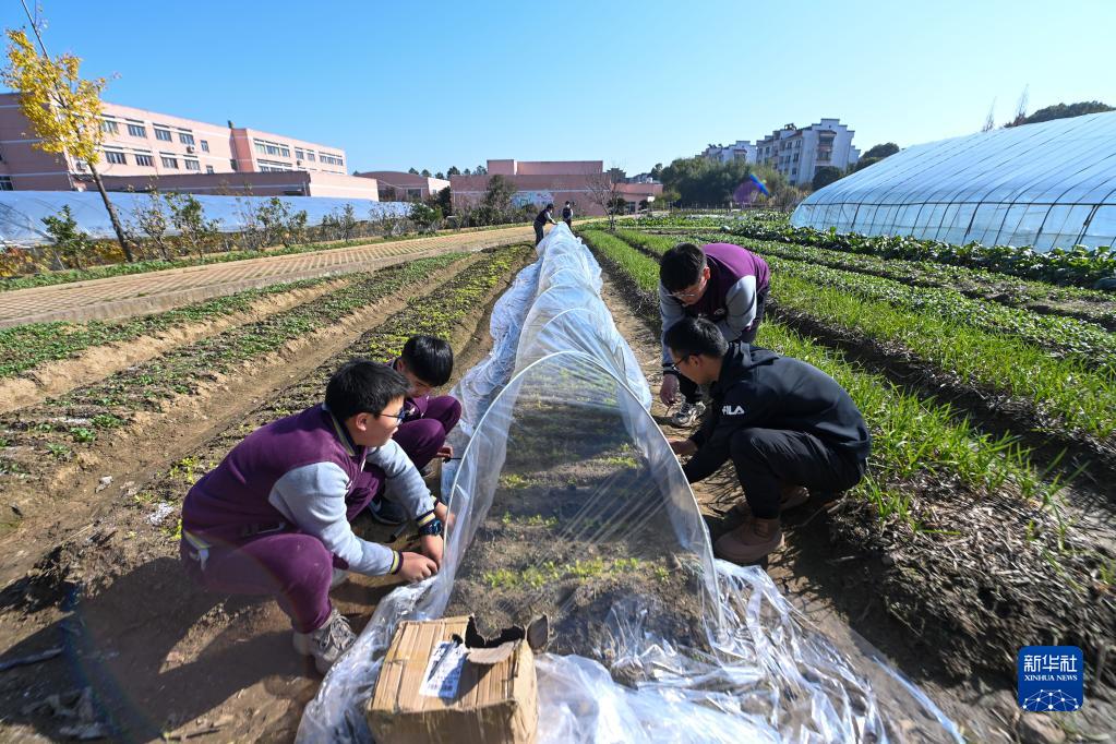 12月15日,諸暨牌頭鎮中心小學(xué)的老師帶領(lǐng)學(xué)生為校內勞動(dòng)教育基地內種植的蔬菜搭建大棚。