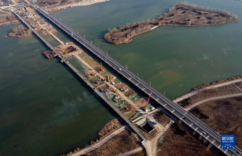 12月15日,工人在石家莊市復興大街滹沱河特大橋建設工地施工(無(wú)人機照片)。