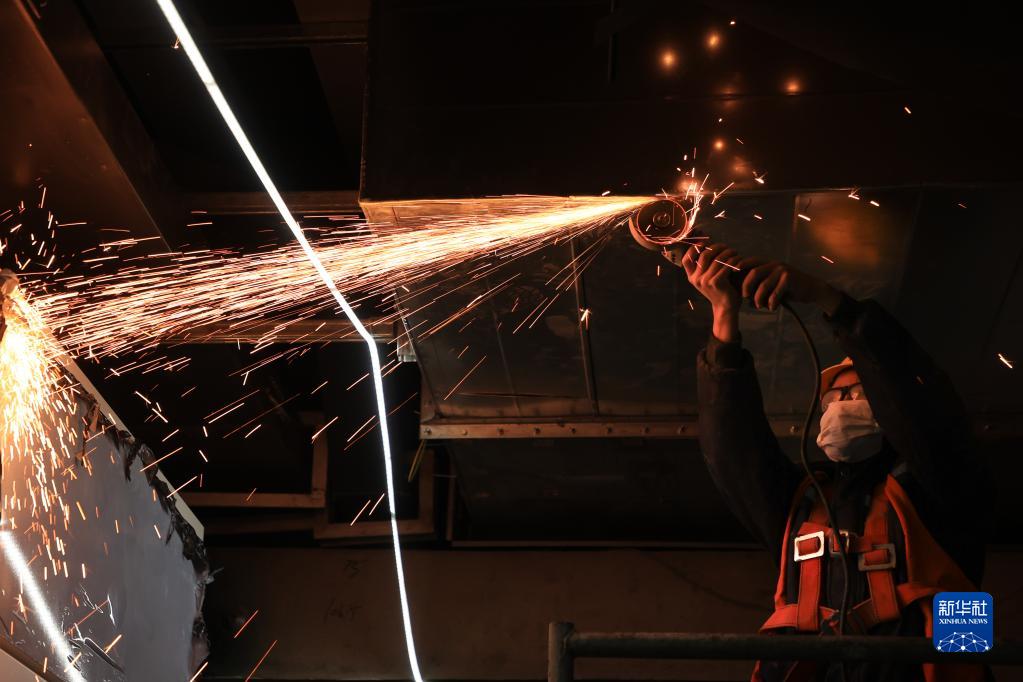 12月16日,中鐵五局建設者在貴陽(yáng)軌道交通三號線(xiàn)東風(fēng)鎮站內切割鋼材。