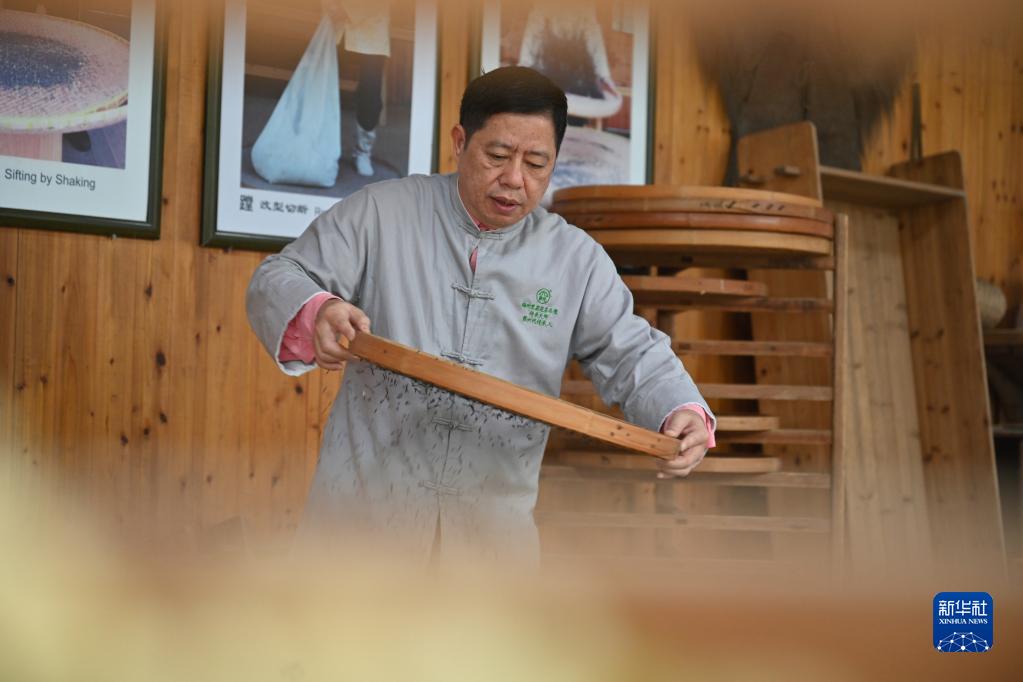 12月16日,在福州茉莉花茶制茶工坊,福州茉莉花茶傳統窨制工藝大師傅天甫進(jìn)行制茶的第一道工序“平”?!捌健本褪怯枚嗫字裰破泛Y茶,將毛茶分出大小、粗細。