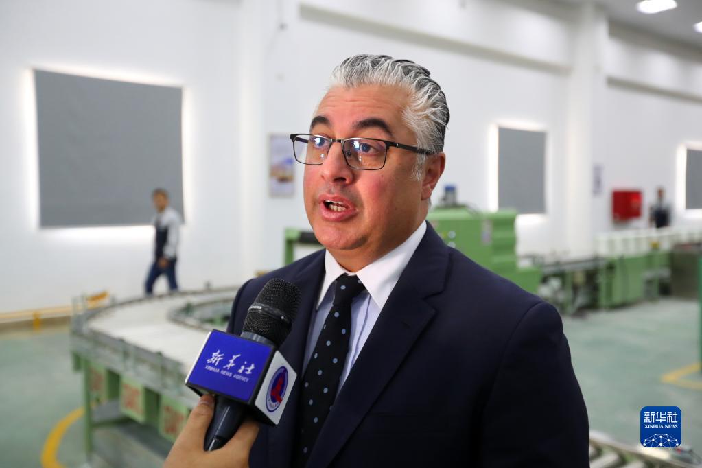 12月15日,在位于埃及蘇伊士省的中國巨石埃及玻璃纖維股份有限公司(巨石埃及公司),蘇伊士運河經(jīng)濟區總局主席瓦利德·賈邁勒丁接受新華社記者采訪(fǎng)。