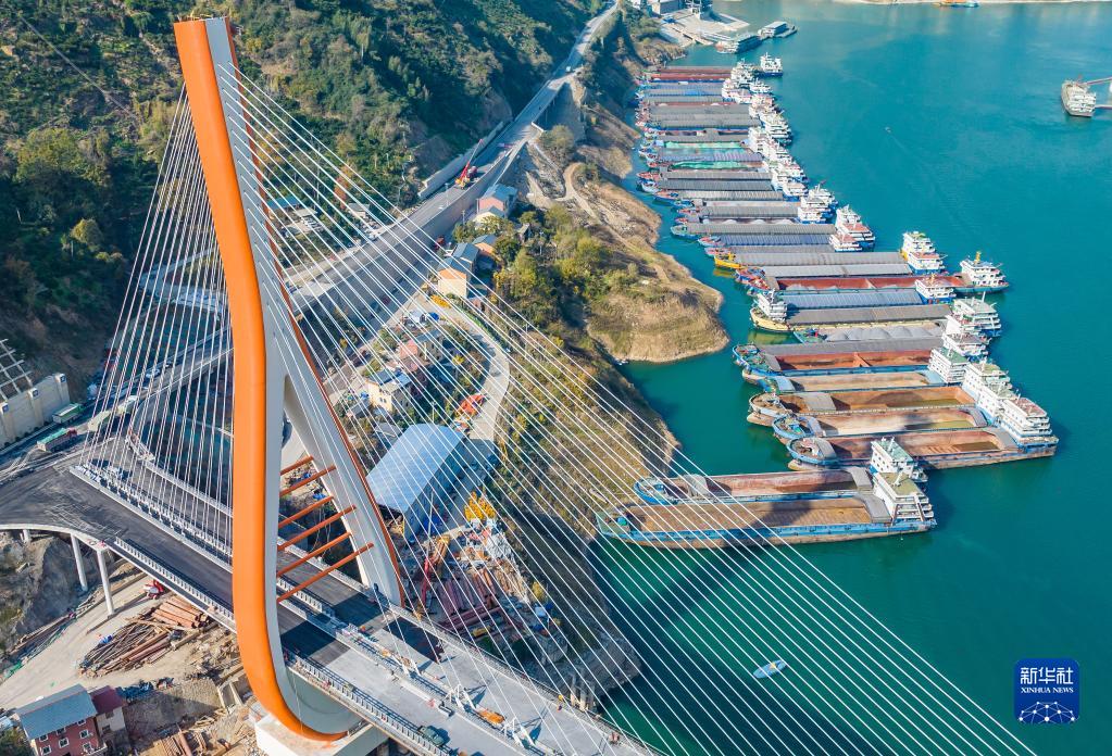 12月17日,工人在湖北省宜昌市興山縣香溪河大橋上施工(無(wú)人機照片)。