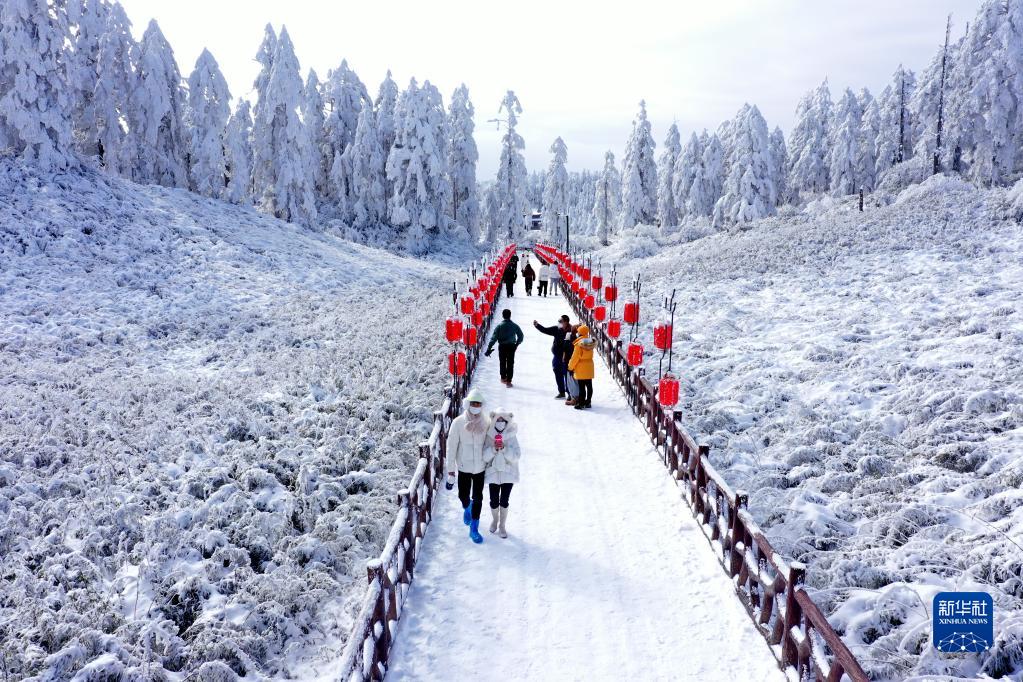 12月18日,游客在瓦屋山游玩賞雪(無(wú)人機照片)。
