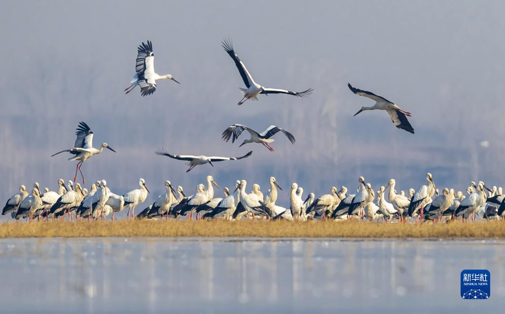 近日,數百只東方白鸛飛臨山東省臨沂市郯城縣沂河畔越冬,給平靜的河灘增添了一道靚麗的風(fēng)景。