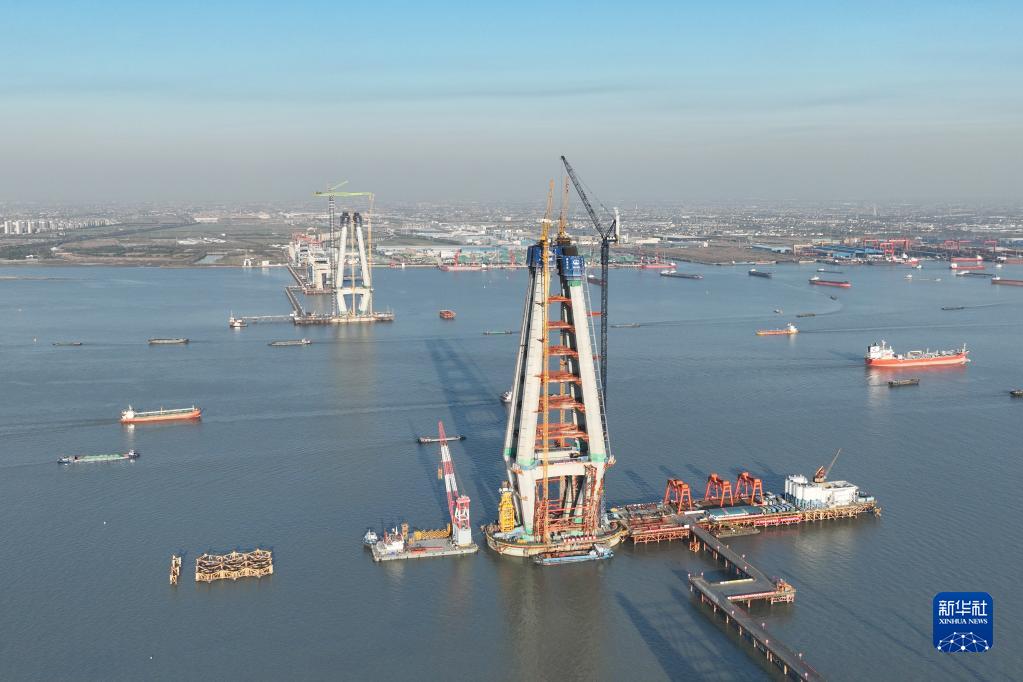 12月19日拍攝的常泰長(cháng)江大橋6號主塔(無(wú)人機照片)。