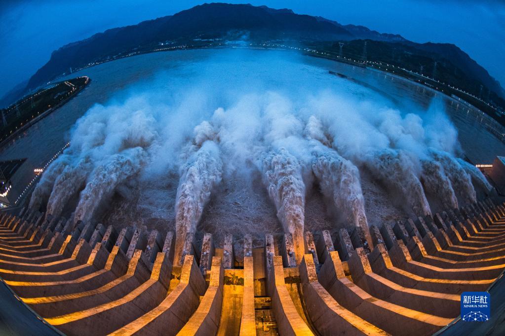 這是2020年8月19日拍攝的長(cháng)江三峽水利樞紐工程開(kāi)啟泄洪深孔泄洪(無(wú)人機照片)。