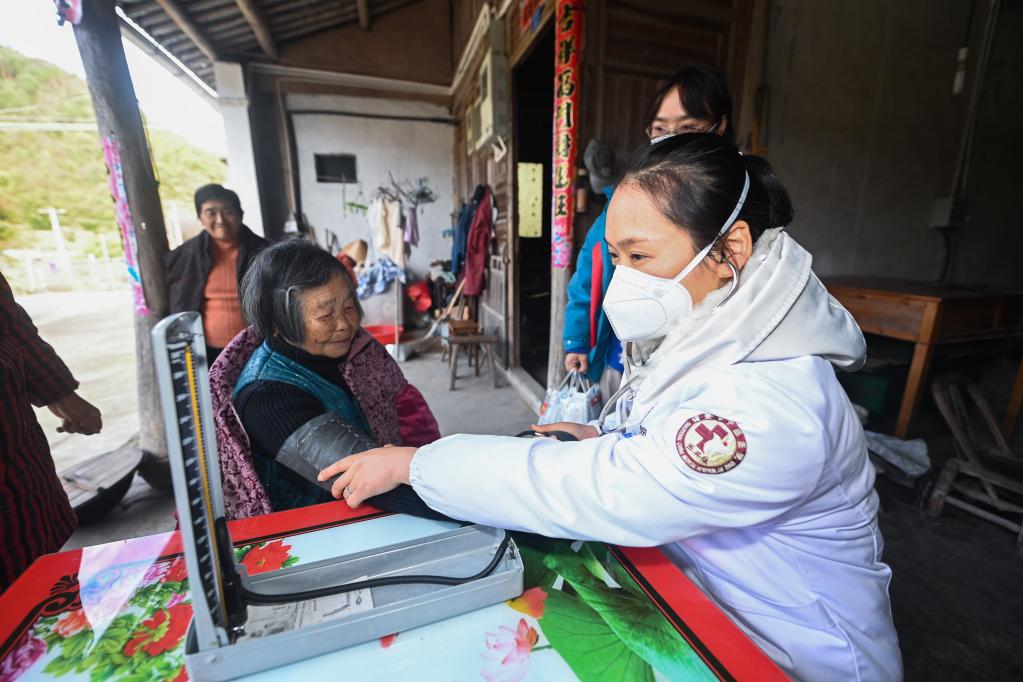 12月20日,東白湖鎮衛生院的醫生給諸暨市東白湖鎮廖宅村的老人進(jìn)行健康體檢。