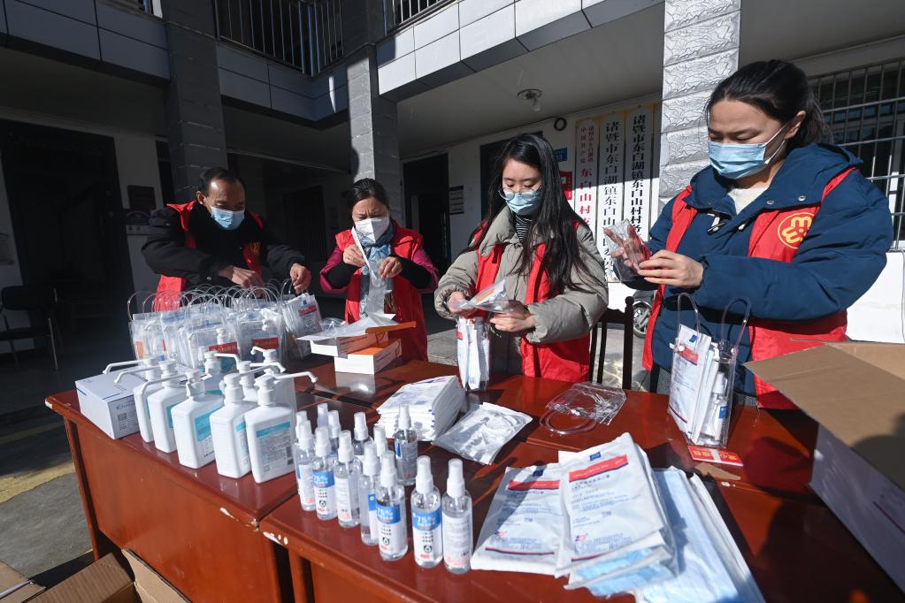 12月20日,在諸暨市東白湖鎮東白山村村委會(huì ),愛(ài)心志愿團的志愿者們分裝愛(ài)心防疫包,愛(ài)心防疫包里有愛(ài)心人士捐贈的抗原檢測試劑、消毒液、口罩、防疫指南等。