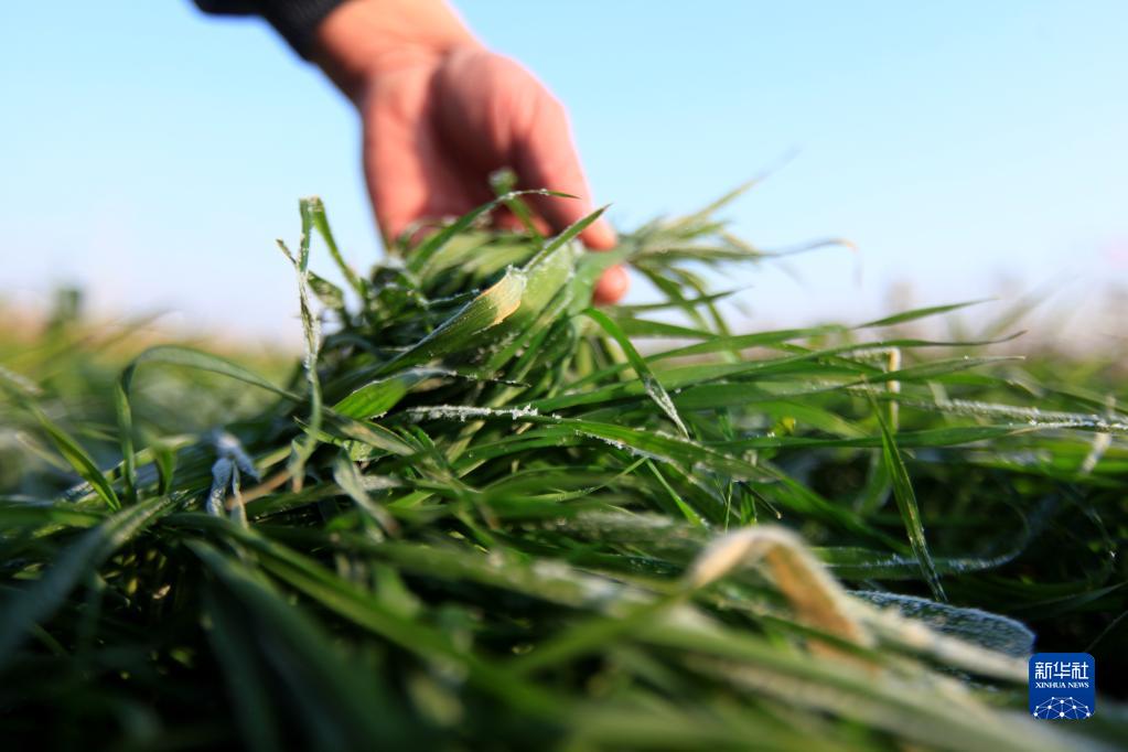 12月21日,山東省臨沂市平邑縣地方鎮東家莊村農民在田間查看麥苗。