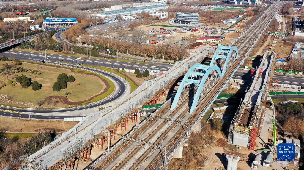 12月22日,中鐵十局的工作人員在對濟鄭高鐵跨濟南經(jīng)十西路槽型梁進(jìn)行合龍作業(yè)(無(wú)人機照片)。