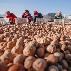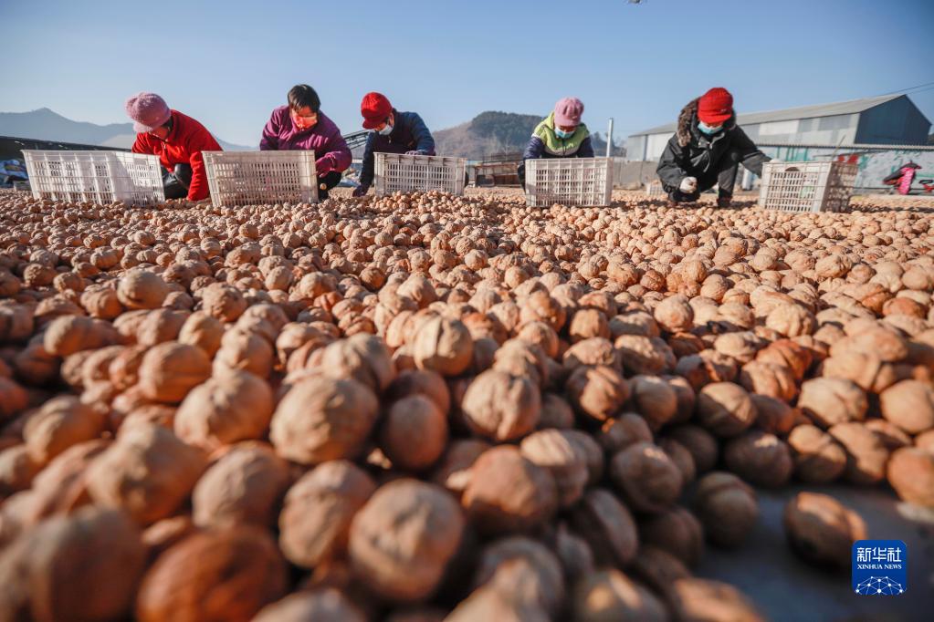 12月23日,農民在遵化市東舊寨鎮石橋頭村一家核桃專(zhuān)業(yè)合作社的場(chǎng)院精選核桃。