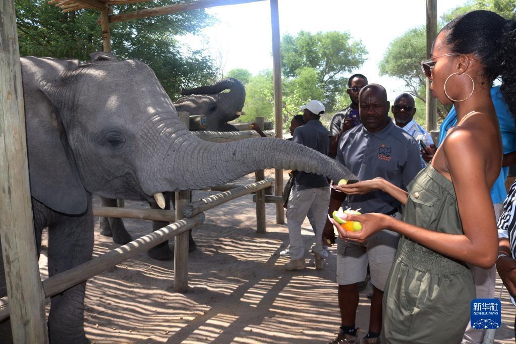 11月26日,博茨瓦納小姐萊塞霍·瓊博在位于博茨瓦納西北部的大象庇護孤兒院喂養大象。