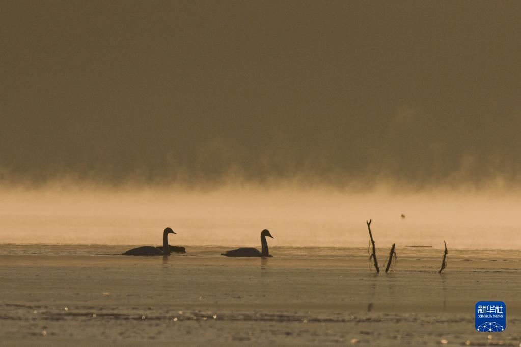 12月23日,大天鵝在青海省化隆回族自治縣群科鎮的黃河水面上休憩覓食。