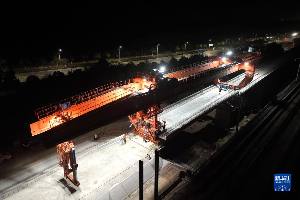 這是12月23日在安徽池州拍攝的中鐵十一局池黃鐵路站前一標最后一榀箱梁架設現場(chǎng)(無(wú)人機照片)。