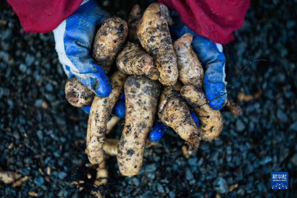 12月21日,農民在貴州省黎平縣九潮鎮萬(wàn)寶山天麻種植基地采收天麻。