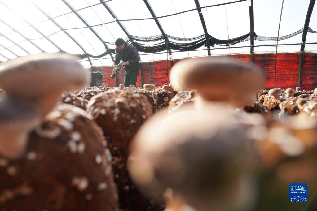 12月23日,內丘縣下馬莊村村民在大棚里采摘香菇。