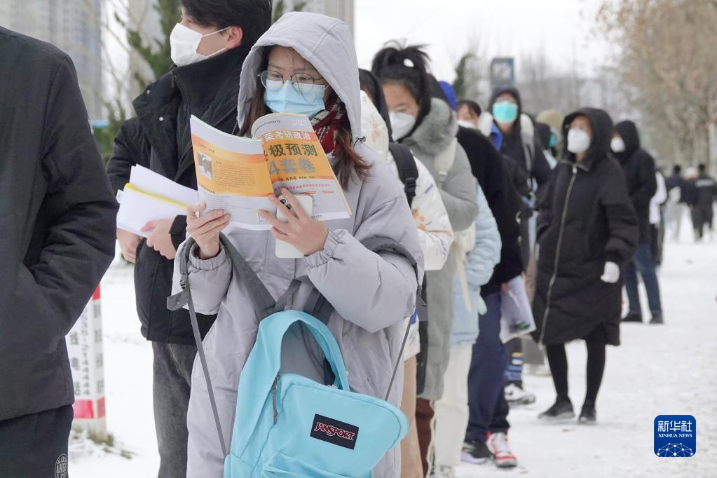 12月24日,在山東萊山一中考點(diǎn)外,考生排隊時(shí)抓緊復習。