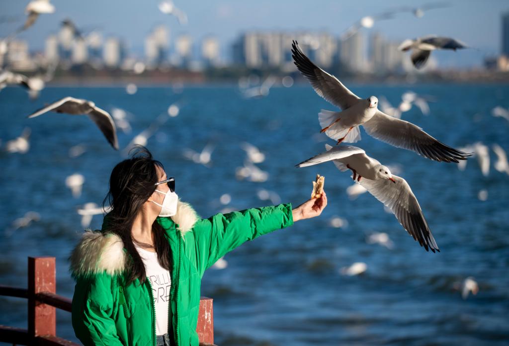 12月23日,一名游客在昆明滇池海埂公園里喂紅嘴鷗。