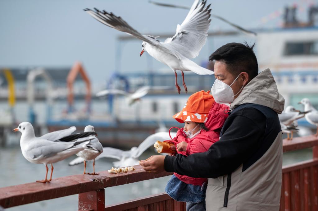 12月24日,一名游客帶著(zhù)小朋友在昆明滇池海埂東碼頭喂紅嘴鷗。