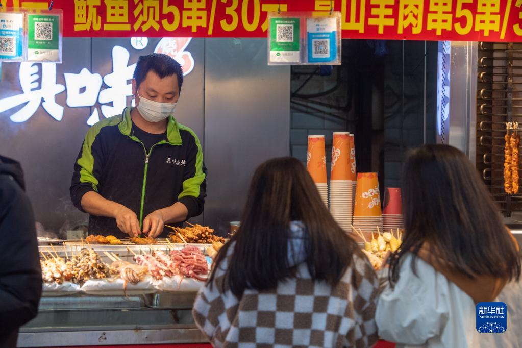 12月23日,在位于重慶解放碑商圈的八一路好吃街上,商家為顧客制作小吃。