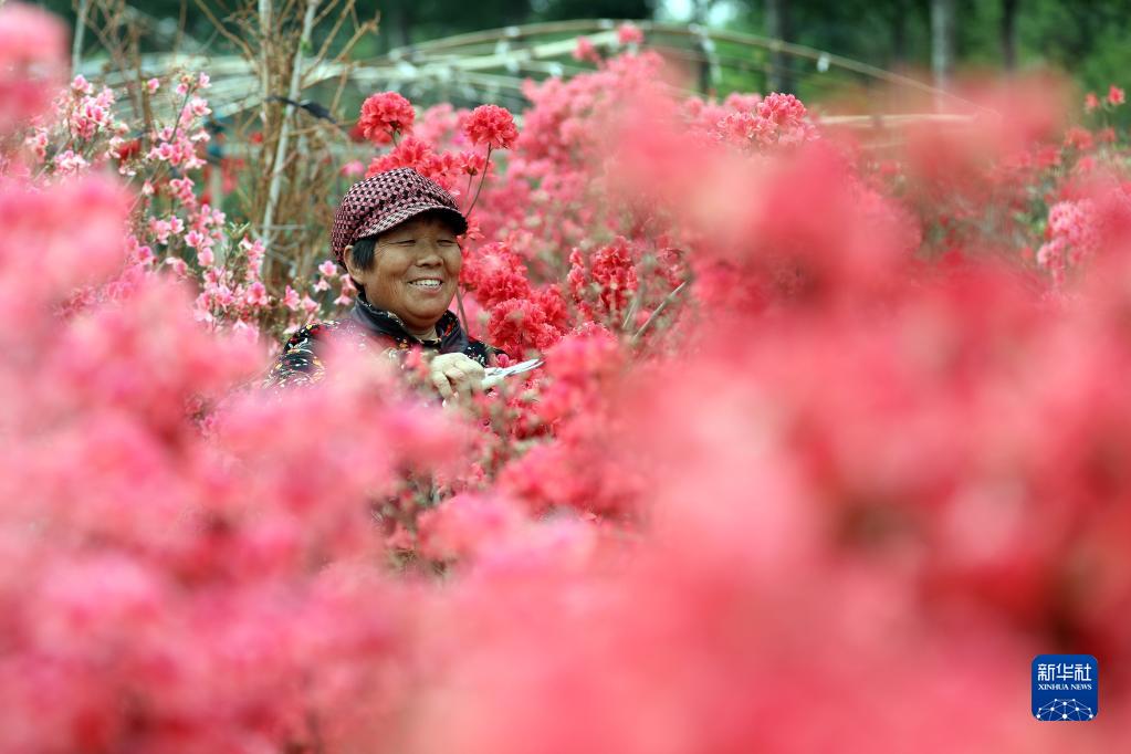 4月29日,在石家莊市藁城區南董鎮南洼村一處花卉苗木基地,工作人員在修剪花卉。