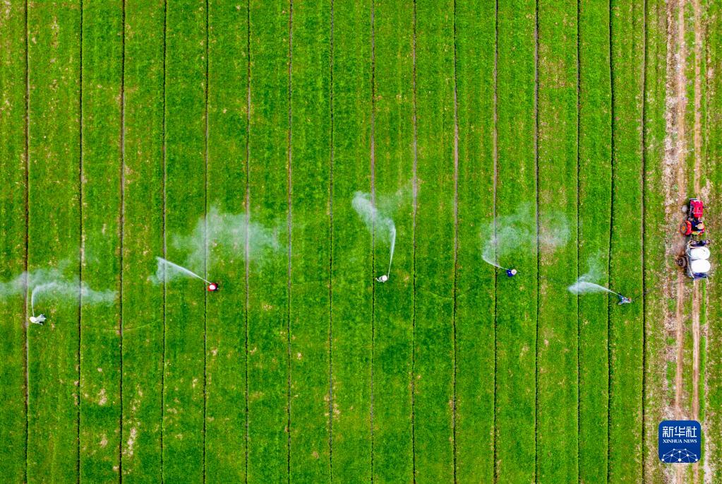 2月16日,安徽省廬江縣白湖鎮農民在進(jìn)行小麥病蟲(chóng)害防治作業(yè)(無(wú)人機照片)。