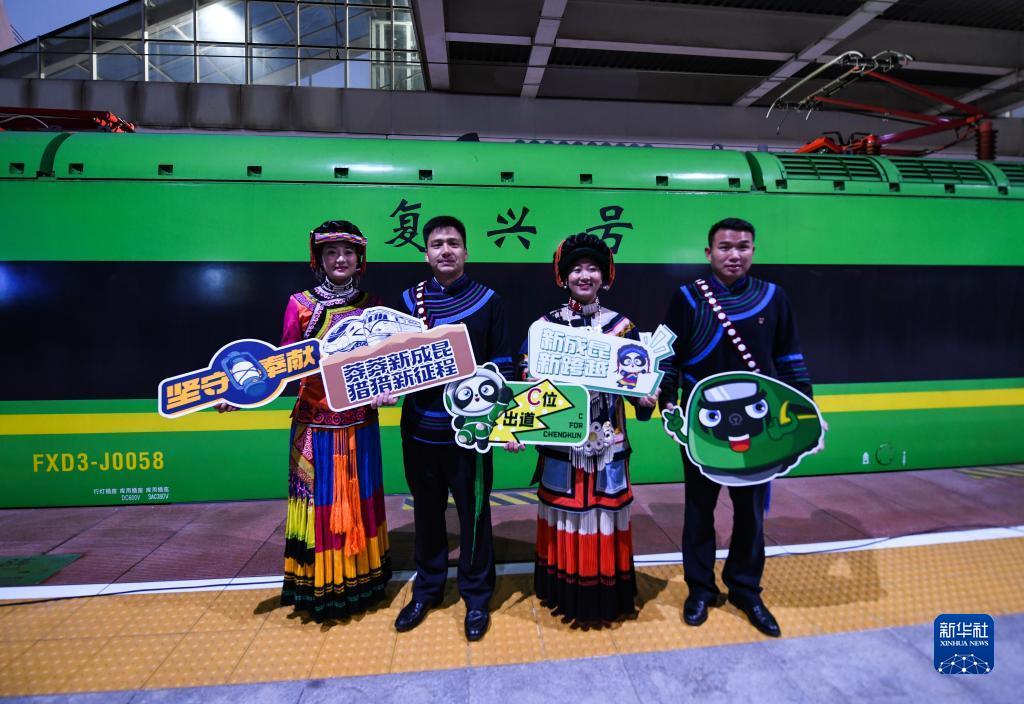 12月26日,在成都南站,彝族群眾在新成昆鐵路首發(fā)列車(chē)出發(fā)前合影留念。