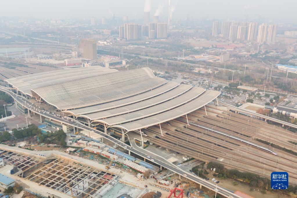 12月26日,一列動(dòng)車(chē)組列車(chē)駛出武漢站(無(wú)人機照片)。