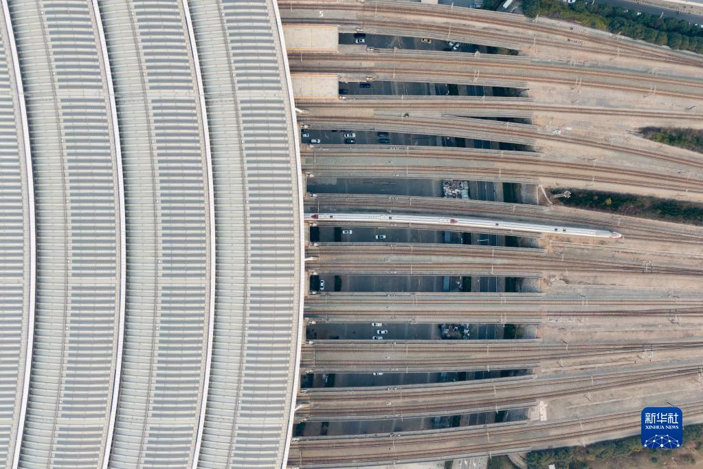 12月26日,一列動(dòng)車(chē)組列車(chē)駛出武漢站(無(wú)人機照片)。