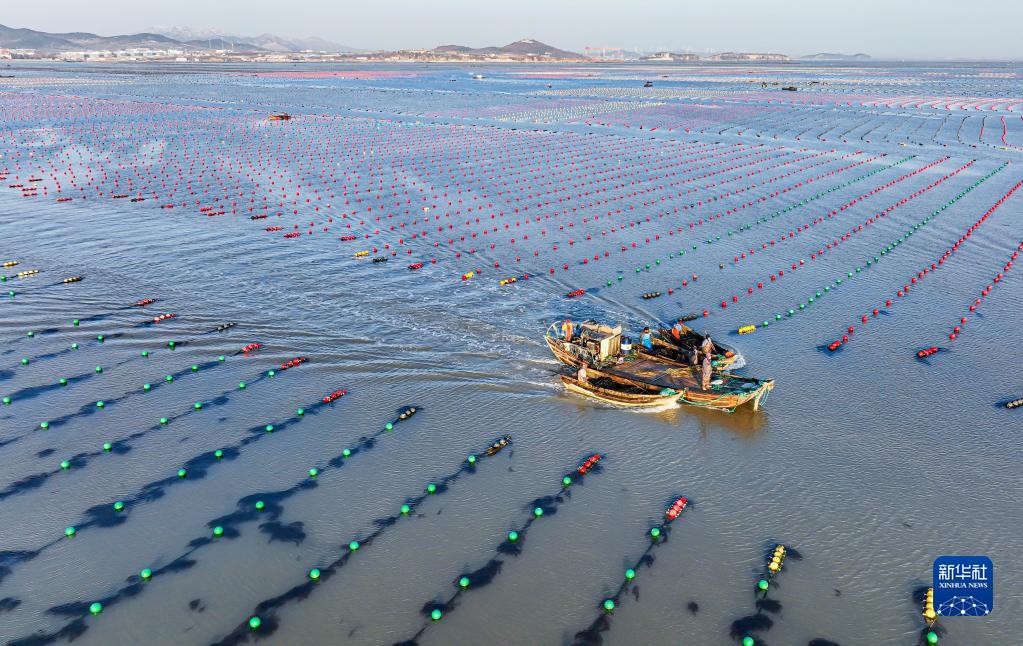 12月27日,在榮成市俚島灣海洋牧場(chǎng)海上養殖區,漁民駕駛漁船出海作業(yè)(無(wú)人機照片)。