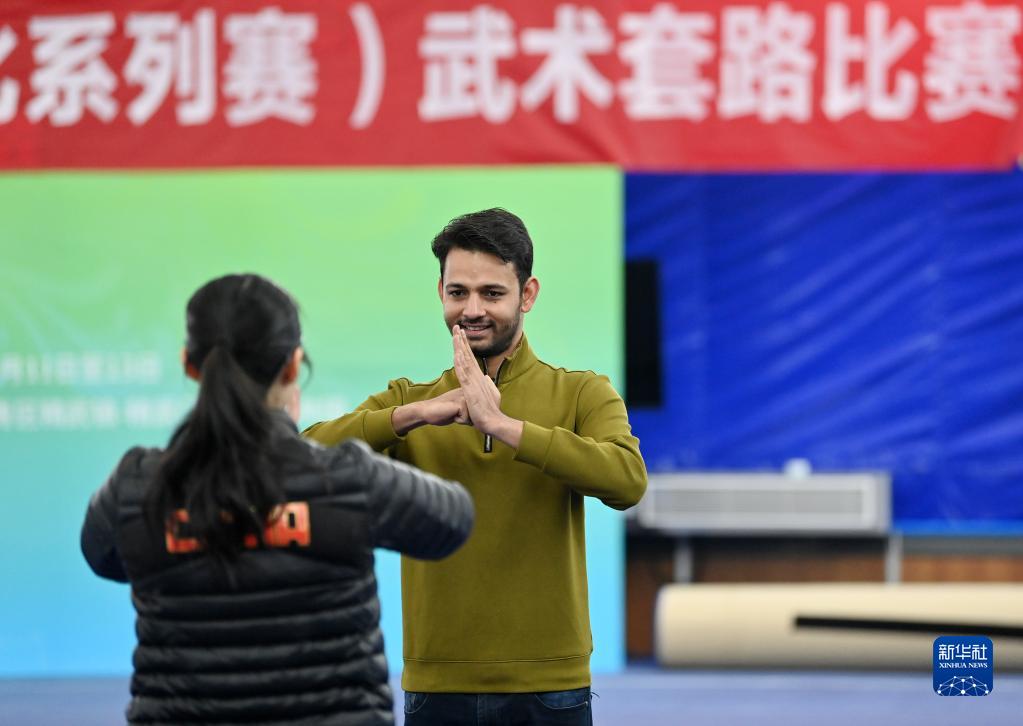 在天津市西青區精武鎮精武會(huì )館,穆罕默德·納比爾(右)和霍靜虹一起練習“霍氏練手拳”(12月25日攝)。