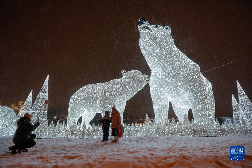 12月27日,人們在俄羅斯首都莫斯科的彩燈裝飾前留影。