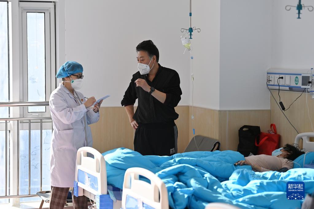 12月28日,醫護人員在天津市西青醫院發(fā)熱門(mén)診擴展區向家屬詢(xún)問(wèn)患者情況。