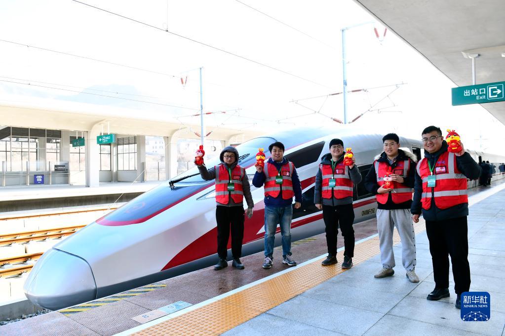 12月30日,在濟(南)萊(蕪)高鐵雪野站,參建單位代表在列車(chē)開(kāi)行前合影留念。
